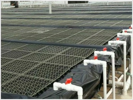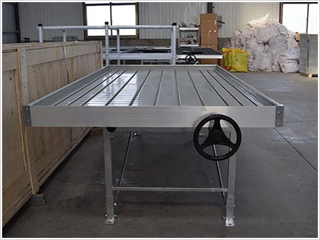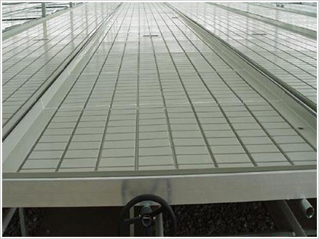 潮汐式灌溉移動苗床栽培床是一種床面為塑料結(jié)構(gòu)的栽培床,其床面采用塑料制作的潮汐式苗盤,它又稱底部灌溉式栽培床。這種潮汐式灌溉移動苗床采用基本與商品化金屬結(jié)構(gòu)栽培床相同的立柱、支撐,床面采用模壓成型的不透水塑料苗盤。灌溉時,苗盤內(nèi)注滿清水或營養(yǎng)液,并使其滯留一定的時間,以使作物依靠毛細(xì)作用通過花盆底部的排水孔吸收水分。之后灌溉水排出栽培床,或收集再利用,或直接排到當(dāng)?shù)氐南滤艿馈?/p>